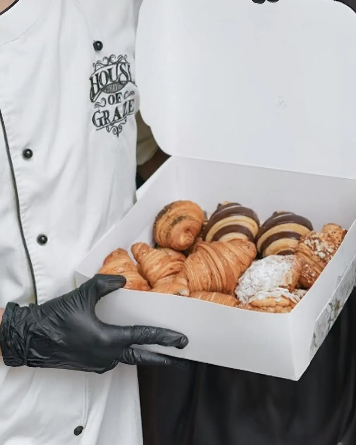 Various types (4 Butter croissants – 4 Almond croissants – 4 Nutella croissants – 4 Dark chocolate croissants – 4 Cheese croissants – 4 Za’atar croissants) with two beautifully packaged mini jams.